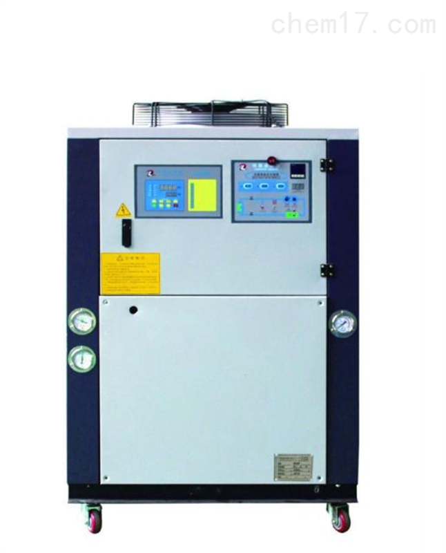风冷式冷水机与一般用水冷却设备是不同的,具有独立的制冷系统,绝不会受气温及环境的影响.风冷水机冷水机主要由压缩机,冷凝器,蒸发器,膨胀阀及电控系统组成,其工作原理是压缩机从蒸发器中吸入低温低压的气态冷媒,将其压缩,形成高温高压液态进入冷凝器进行散热,转换成常温高压饱和蒸汽,通过膨胀阀的喷射,进入蒸发器,转化为低温低压的气体,与蒸发器中的水进行热交换,大量吸收水中的热量,从而产生冷冻水,通过循环泵进入需要冷却的设备或是产品,完成制冷工艺.
